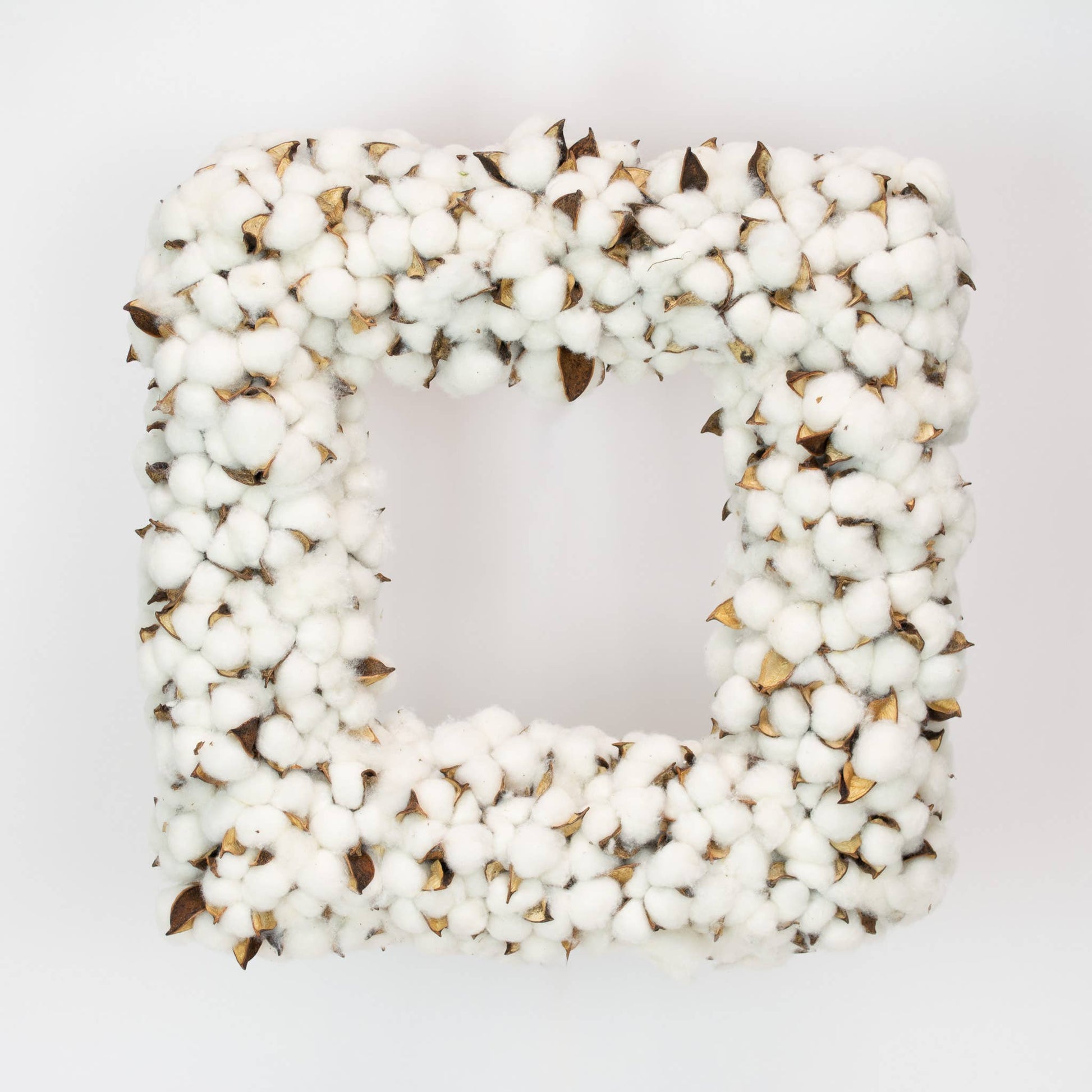 Introducing the Faux Cotton Square Wreath - 19 inch from Mills Floral Company. This unique square wreath is a rustic delight, adorned with thick, fluffy cotton bolls set on a square base. Its neutral palette and distinctive shape make it a versatile piece for any season. Whether gracing a door or serving as a table centerpiece with a vase or bowl, this wreath adds a touch of farmhouse elegance to any décor. It's a top choice for gift shops, event planners, and interior designers, promising to infuse spaces with the warmth and simplicity of country living. • 19" diameter